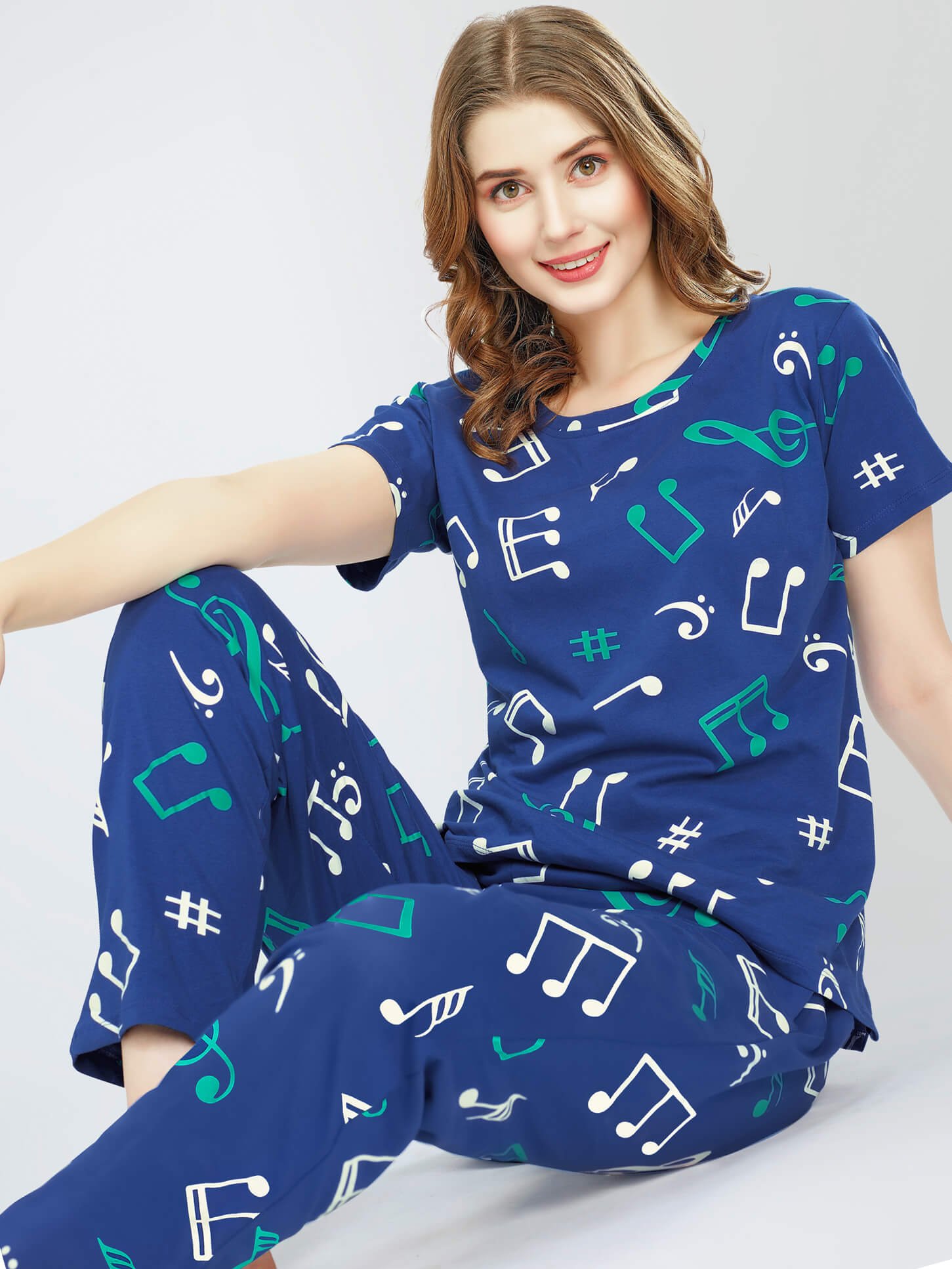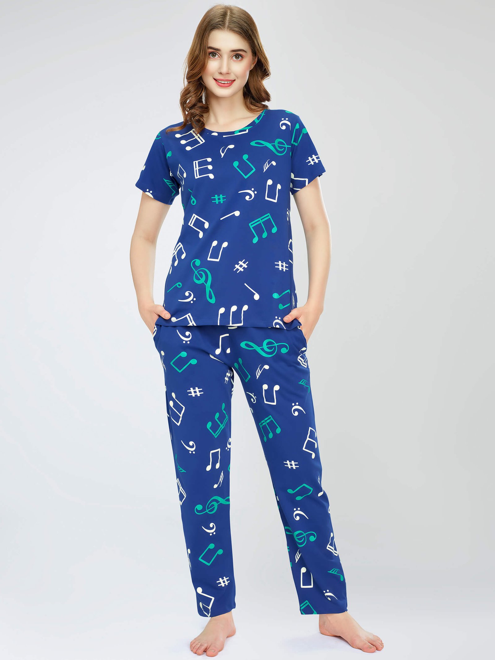 Women’s Blue Musical Notes Printed Cotton Night Dress of Top and Pajama set