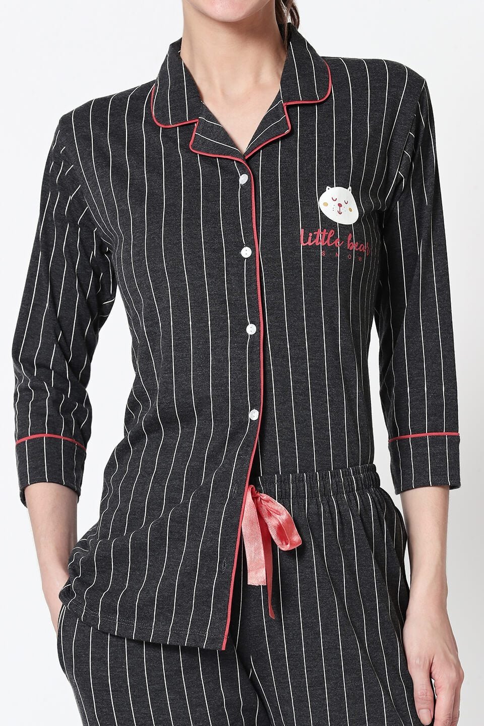 - Charcoal black striped shirt, has a notched collar, three-quarter sleeves