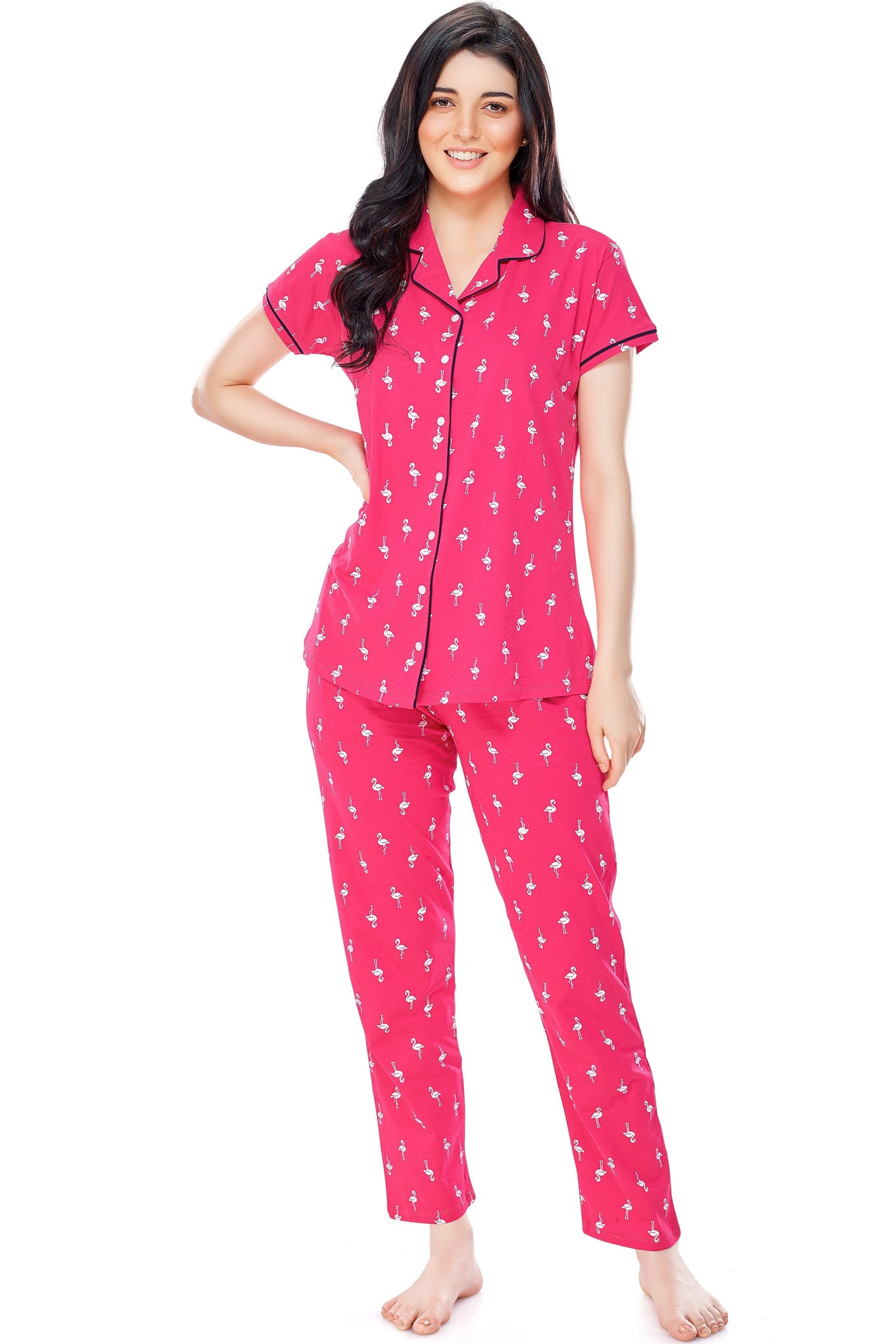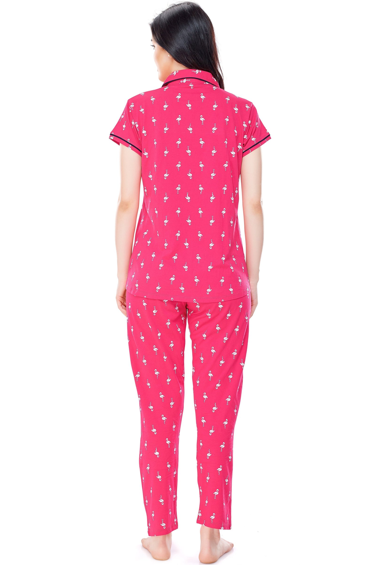 - Pink flamingo printed night suit consists of shirt and pyjamas