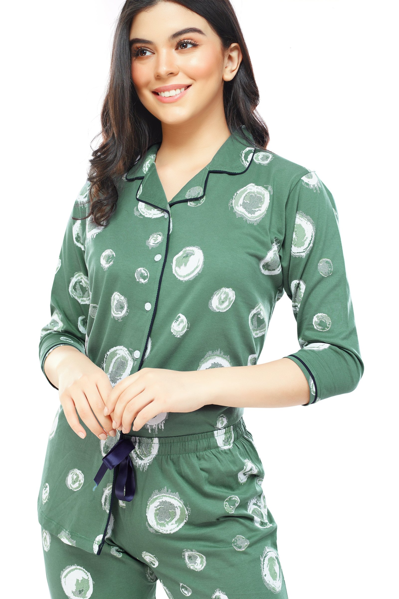 - Green bubble printed night suit consists of shirt and pyjamas