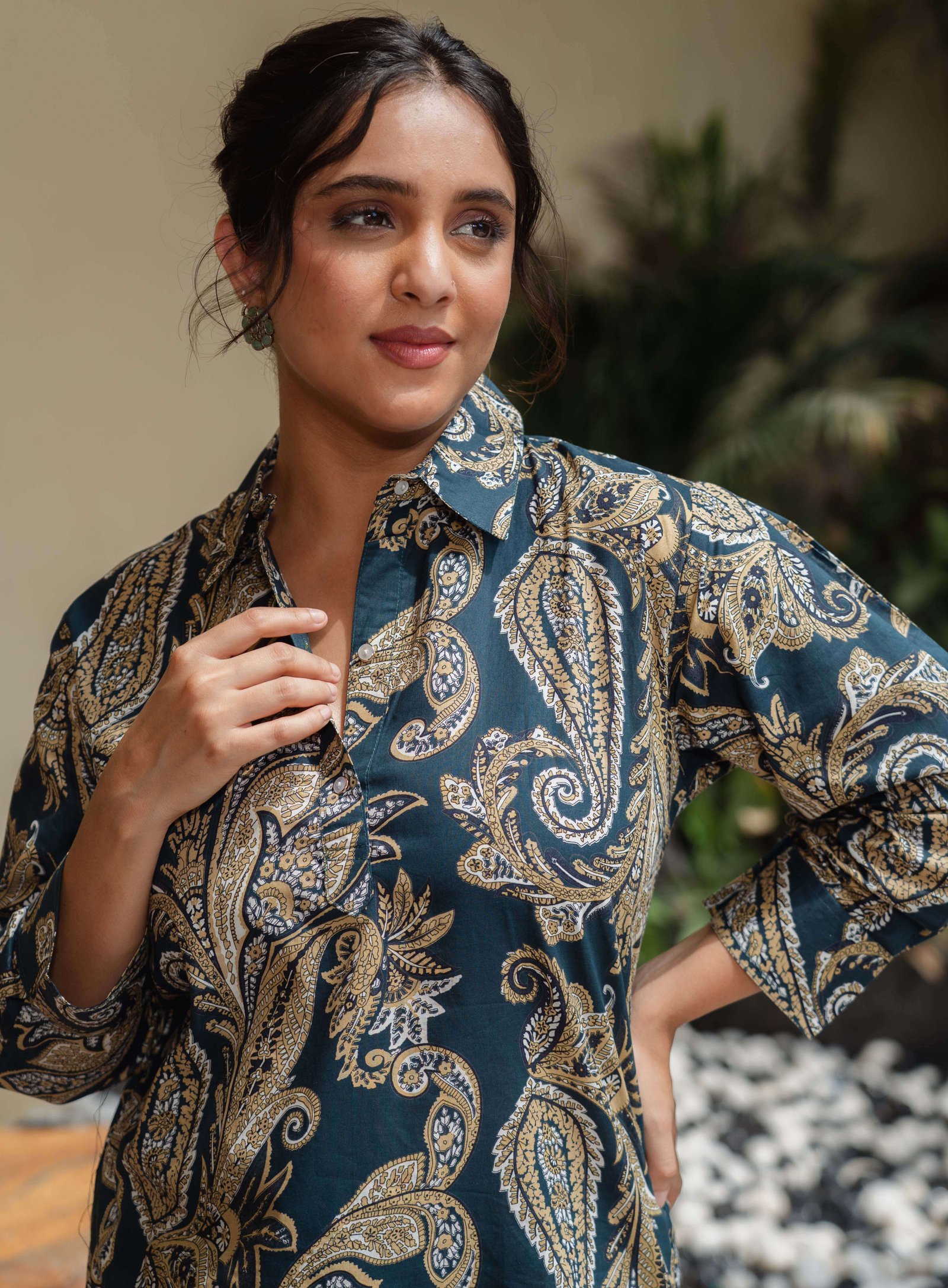- Cotton Grey Ethnic Printed  Kurti, has a notched collar, short sleeves