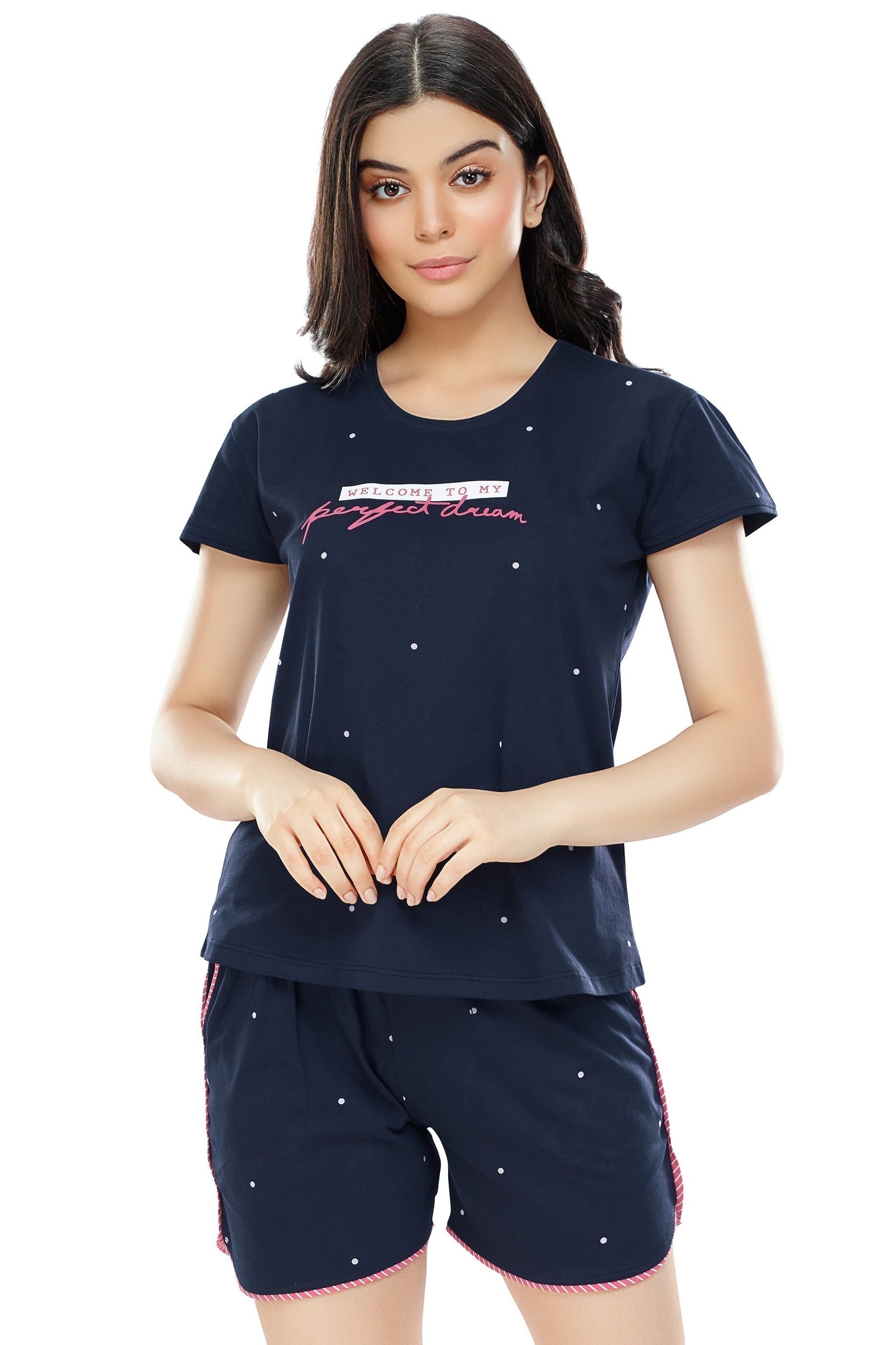 - Navy blue polka dot printed top, has a round neck, short sleeves