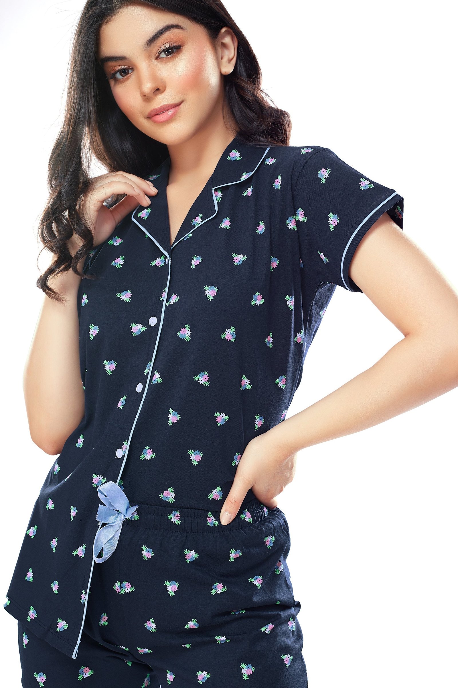- Navy Blue floral printed night suit consists of shirt and pyjamas