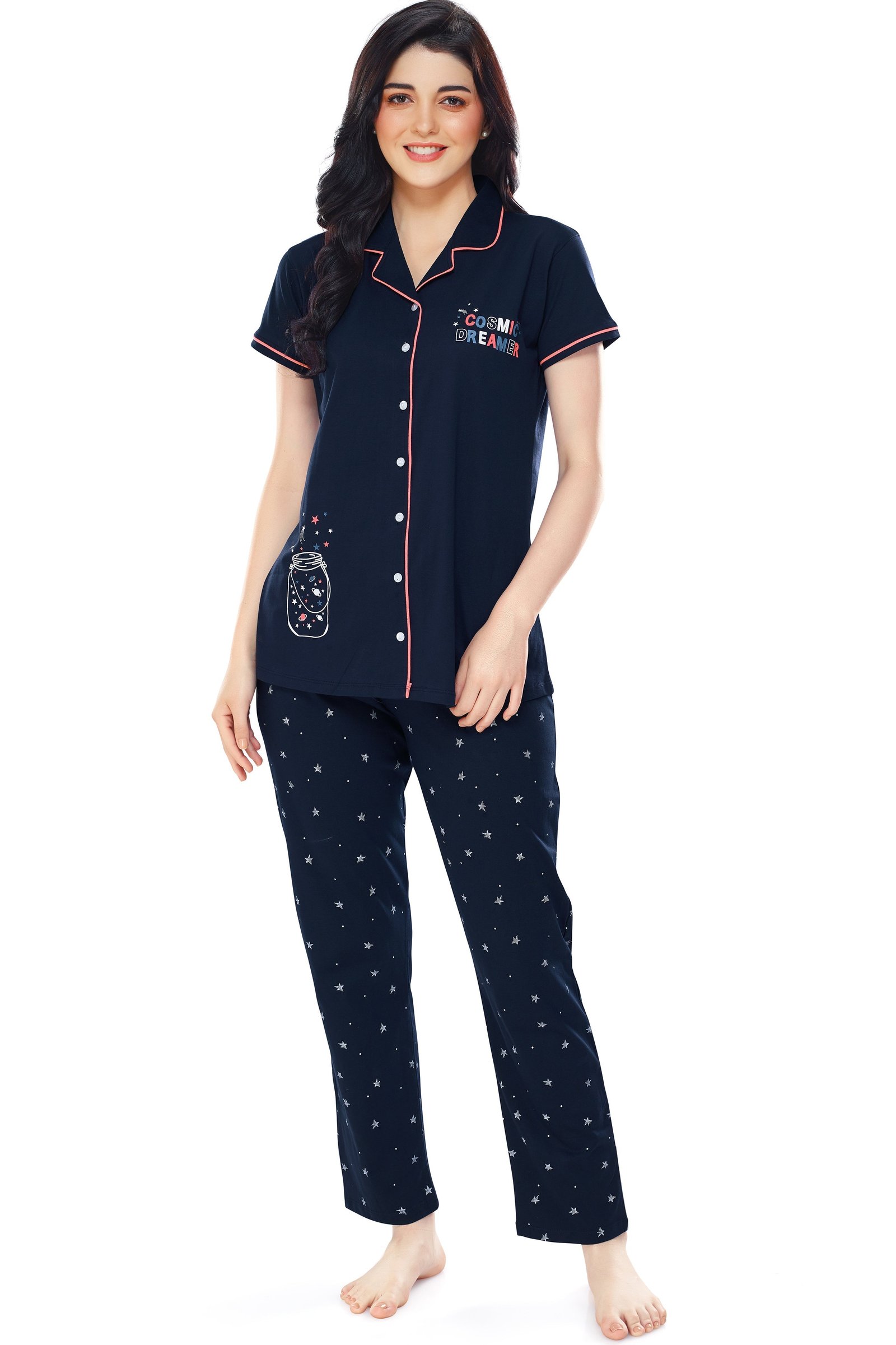 - Navy blue printed shirt, has a notched collar, short sleeves