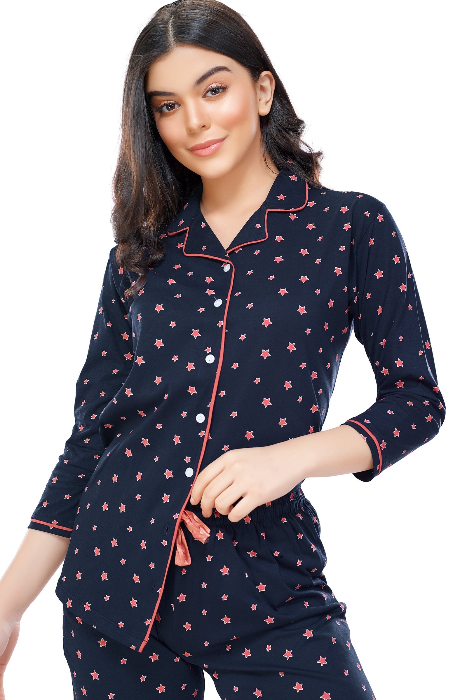 - Navy blue star printed night suit consists of shirt and pyjamas