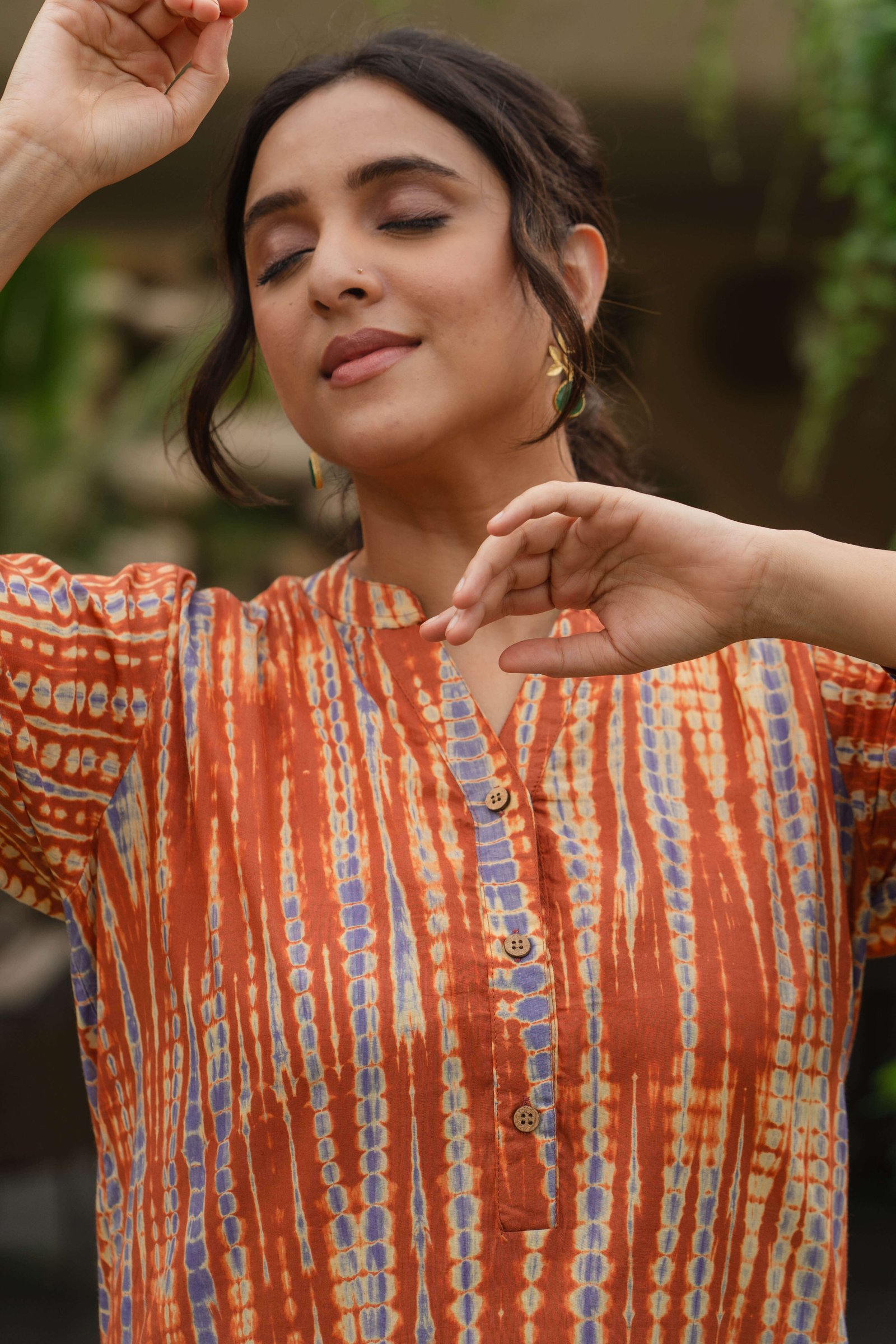 - Cotton Orange Tie-Dye Printed  Kurti, has a notched collar, short sleeves