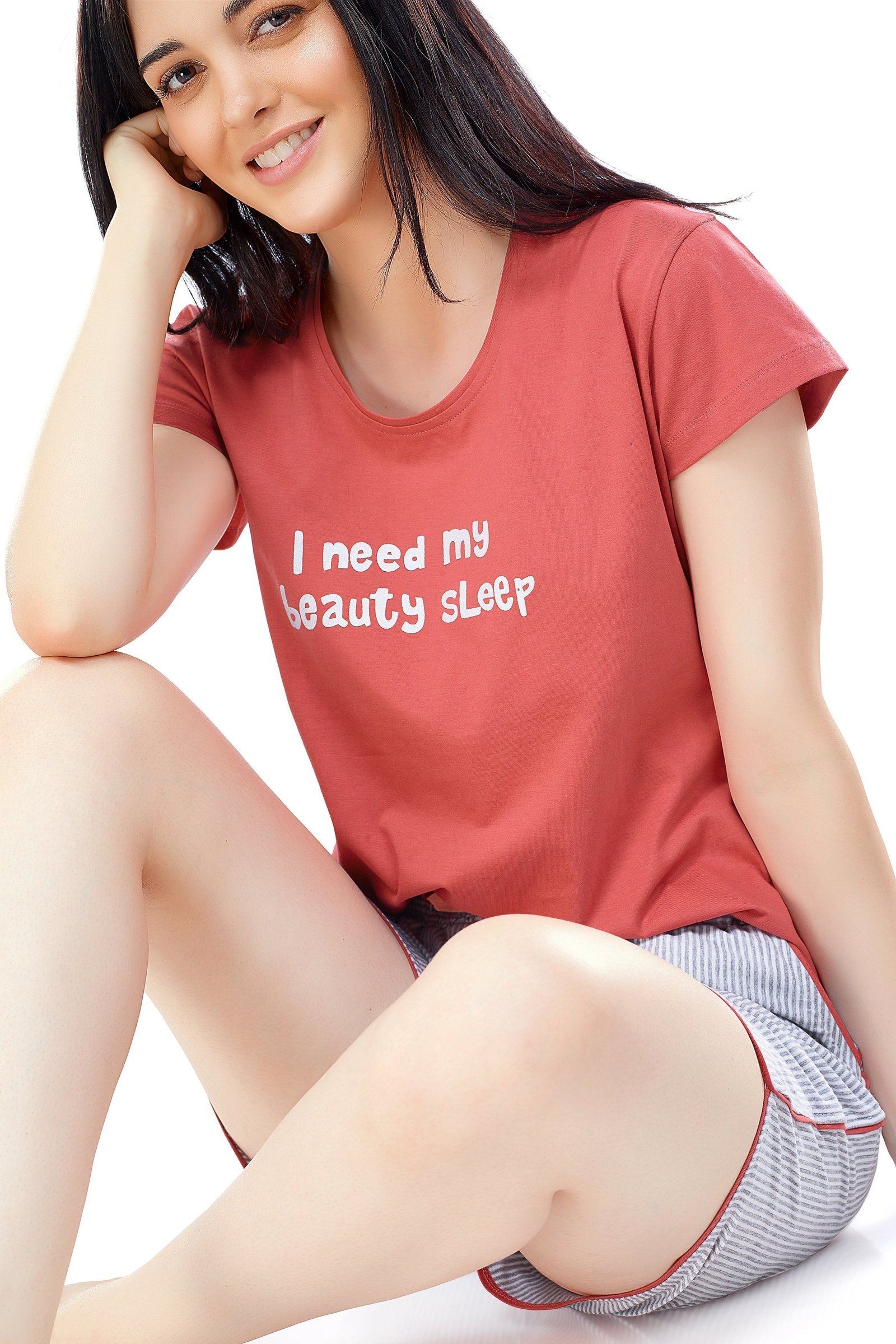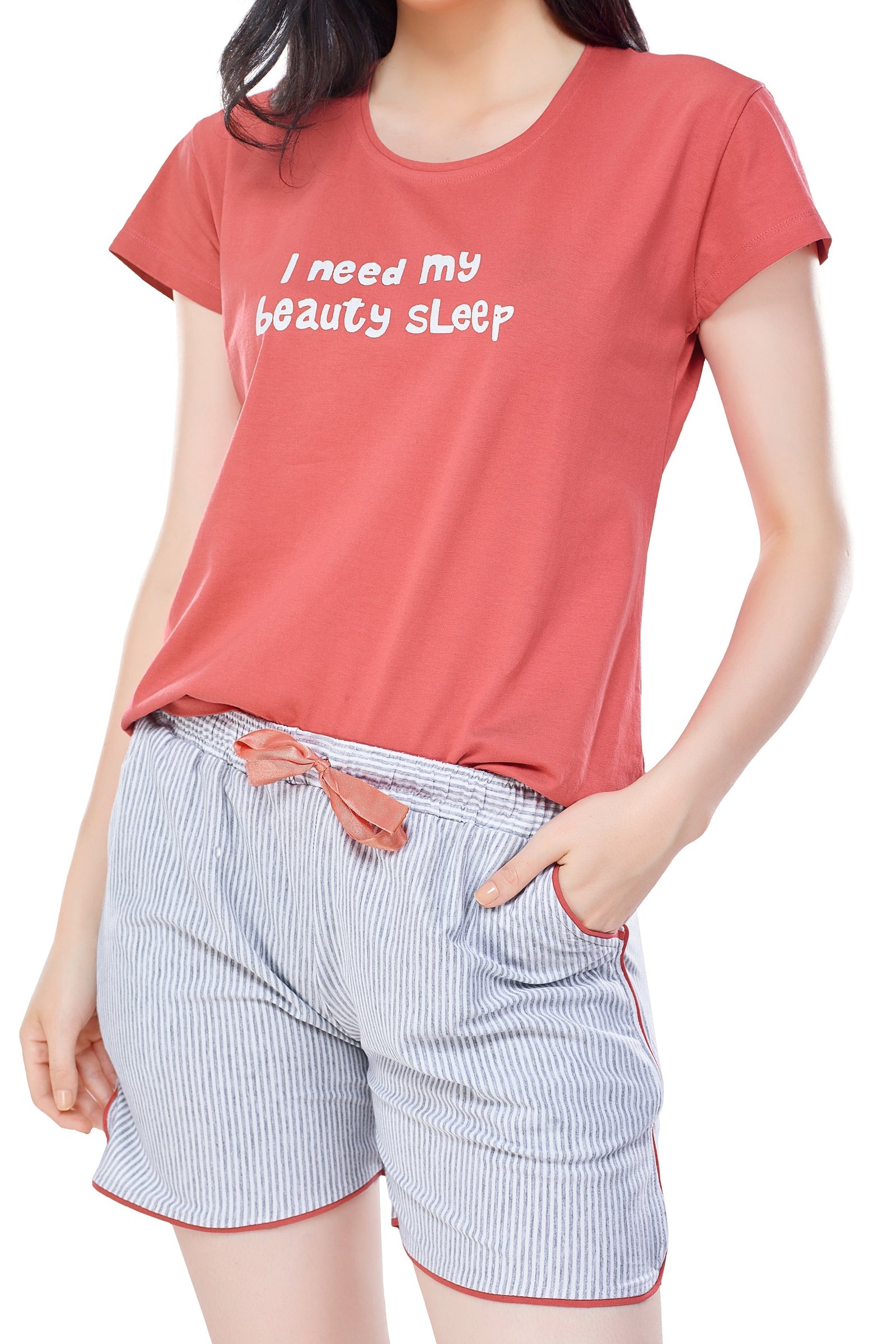 - Peach printed & striped night suit consists of top and shorts