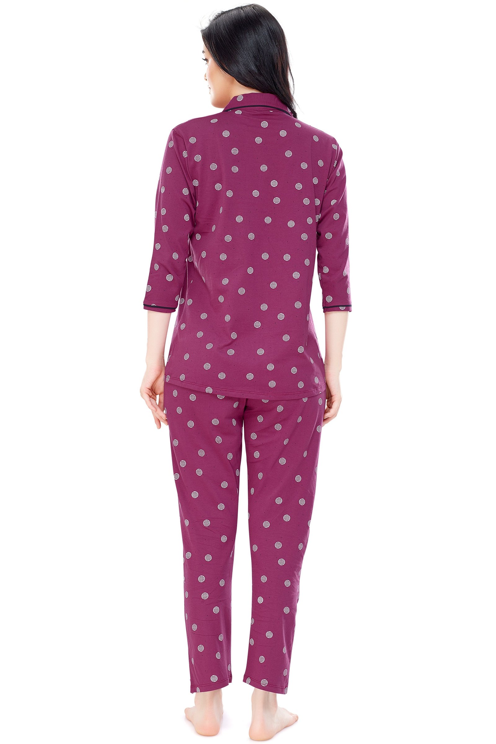 - A pair of plum red geometric printed pyjama, has drawstring closure