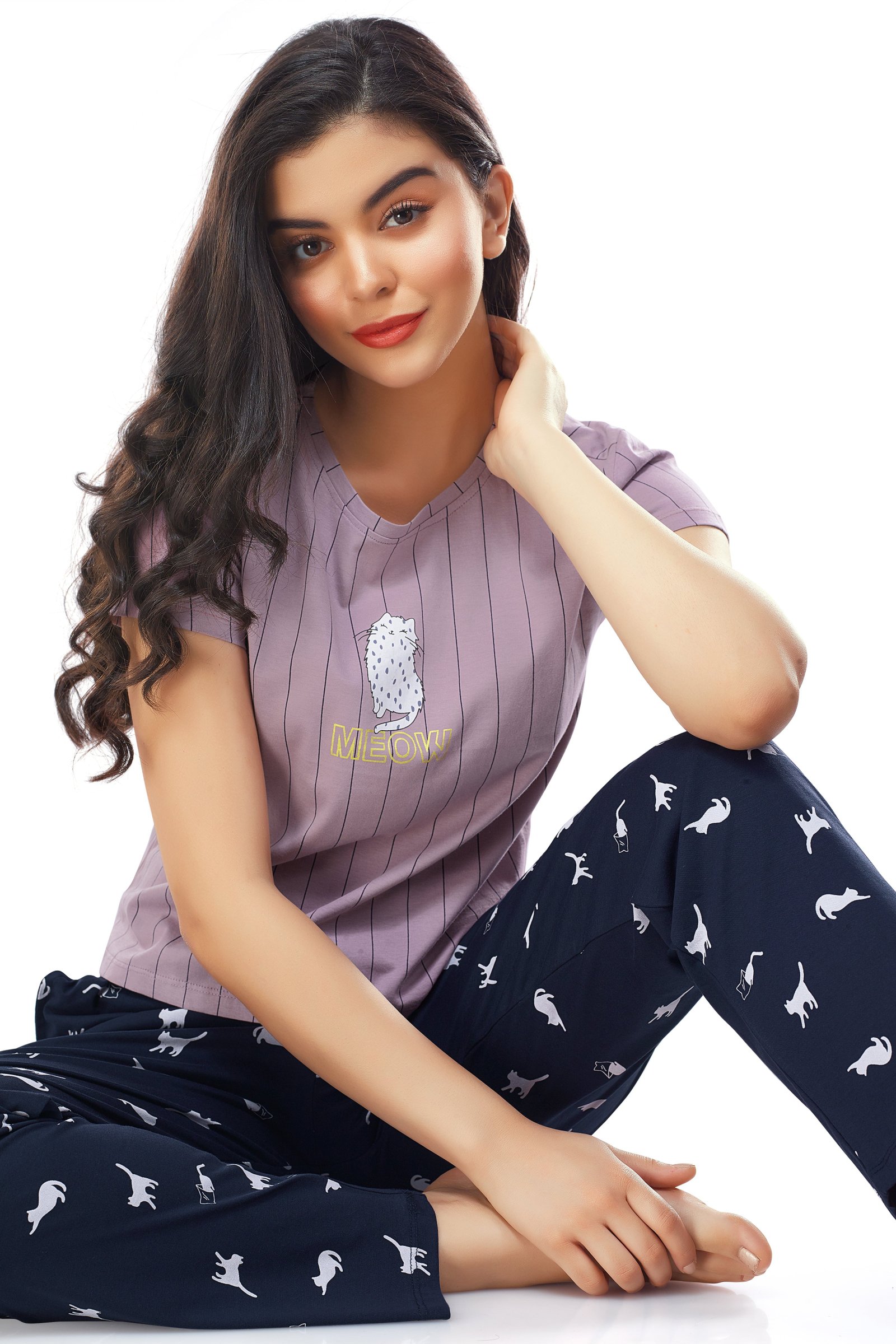 - Purple and navy blue night suit consists of crop top and pyjamas