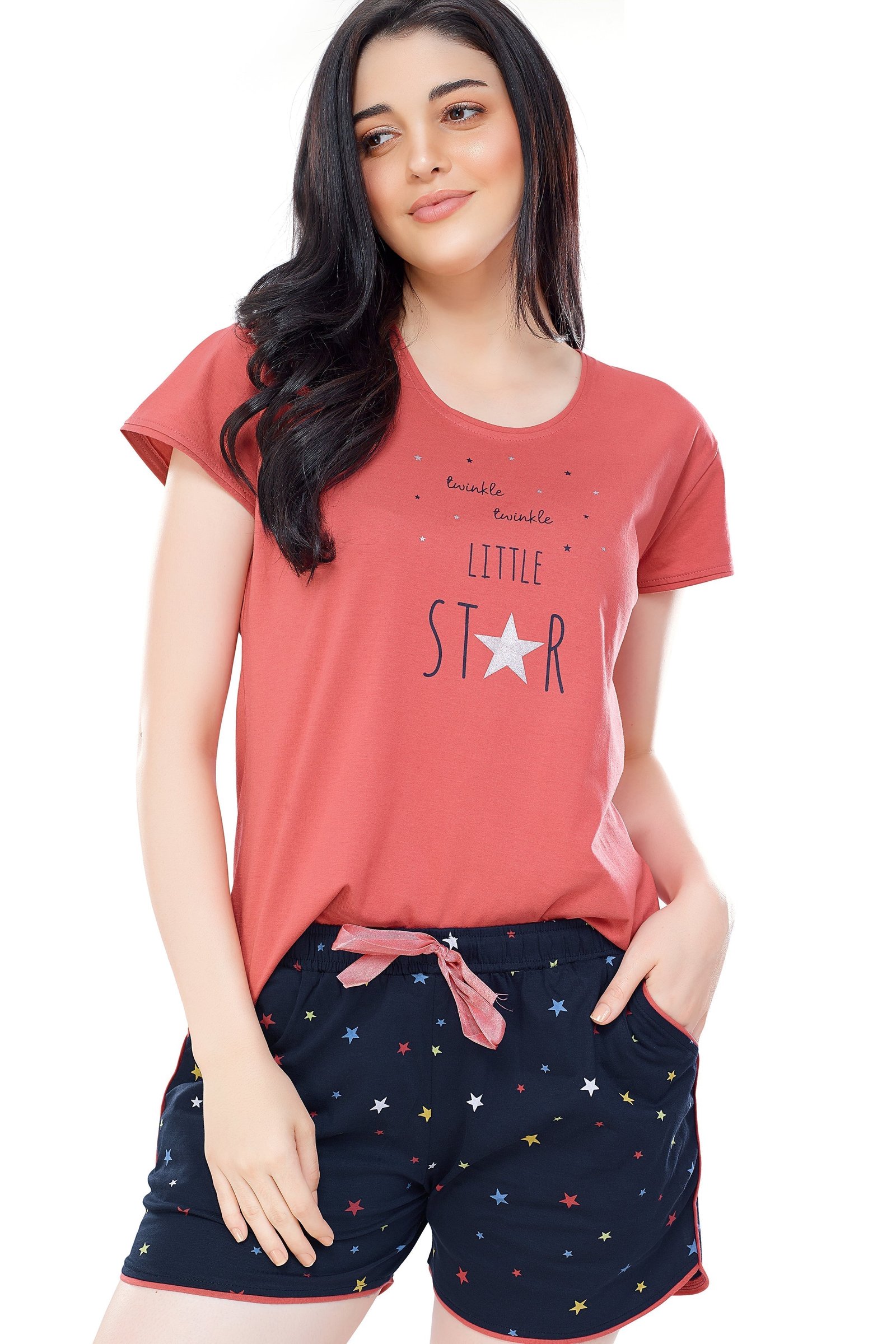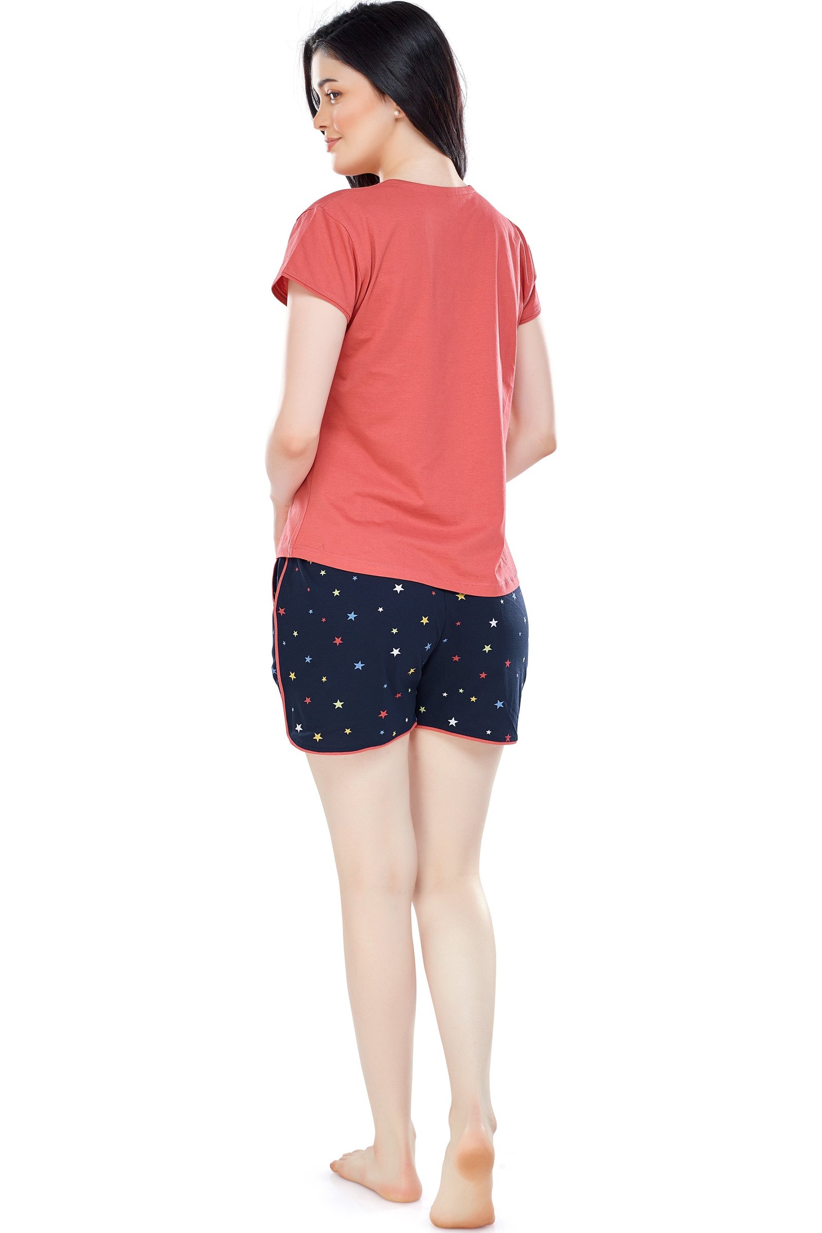 - Rust brown and navy blue star printed night suit consists of top and shorts