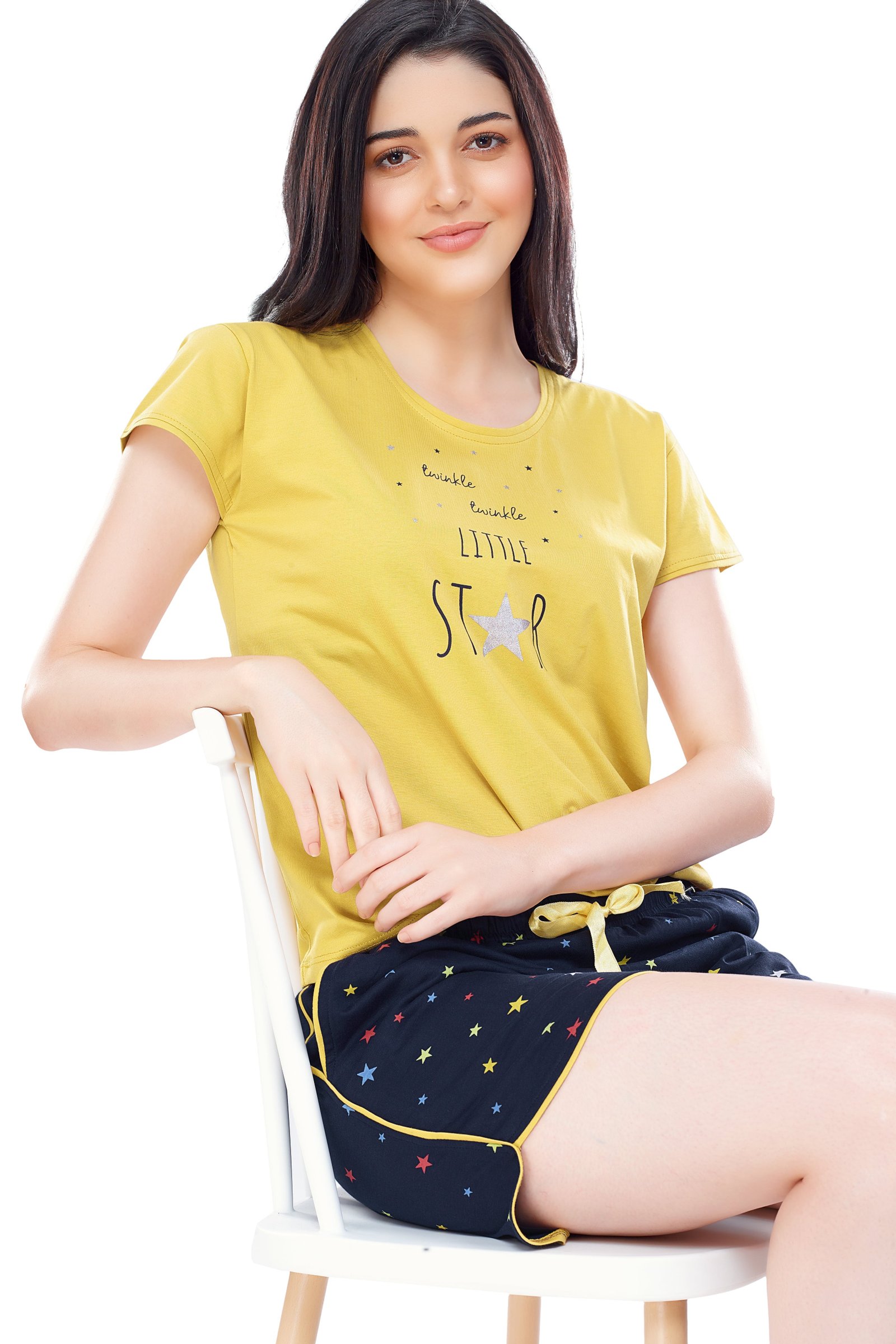 - Yellow and navy blue star printed night suit consists of top and shorts