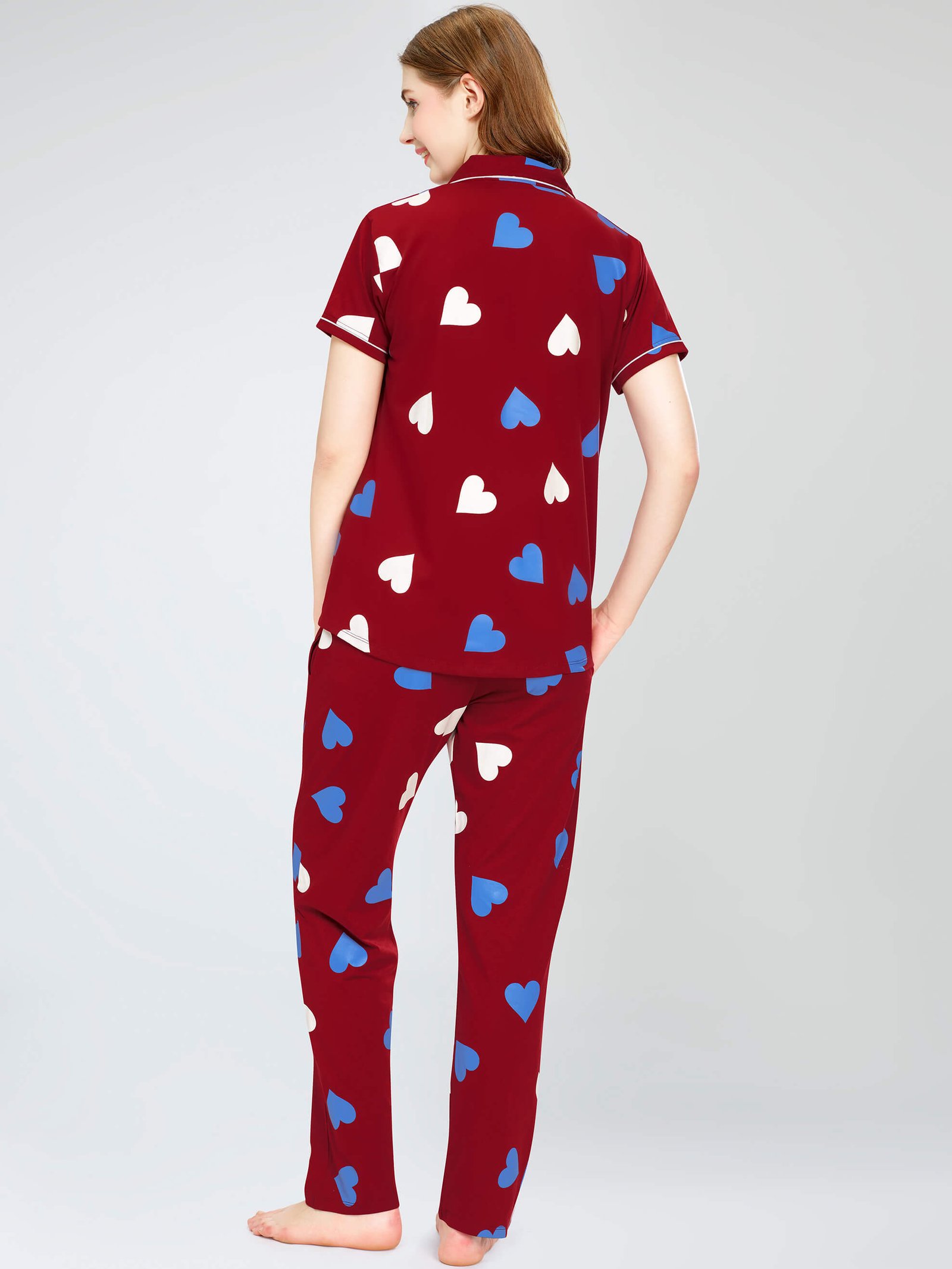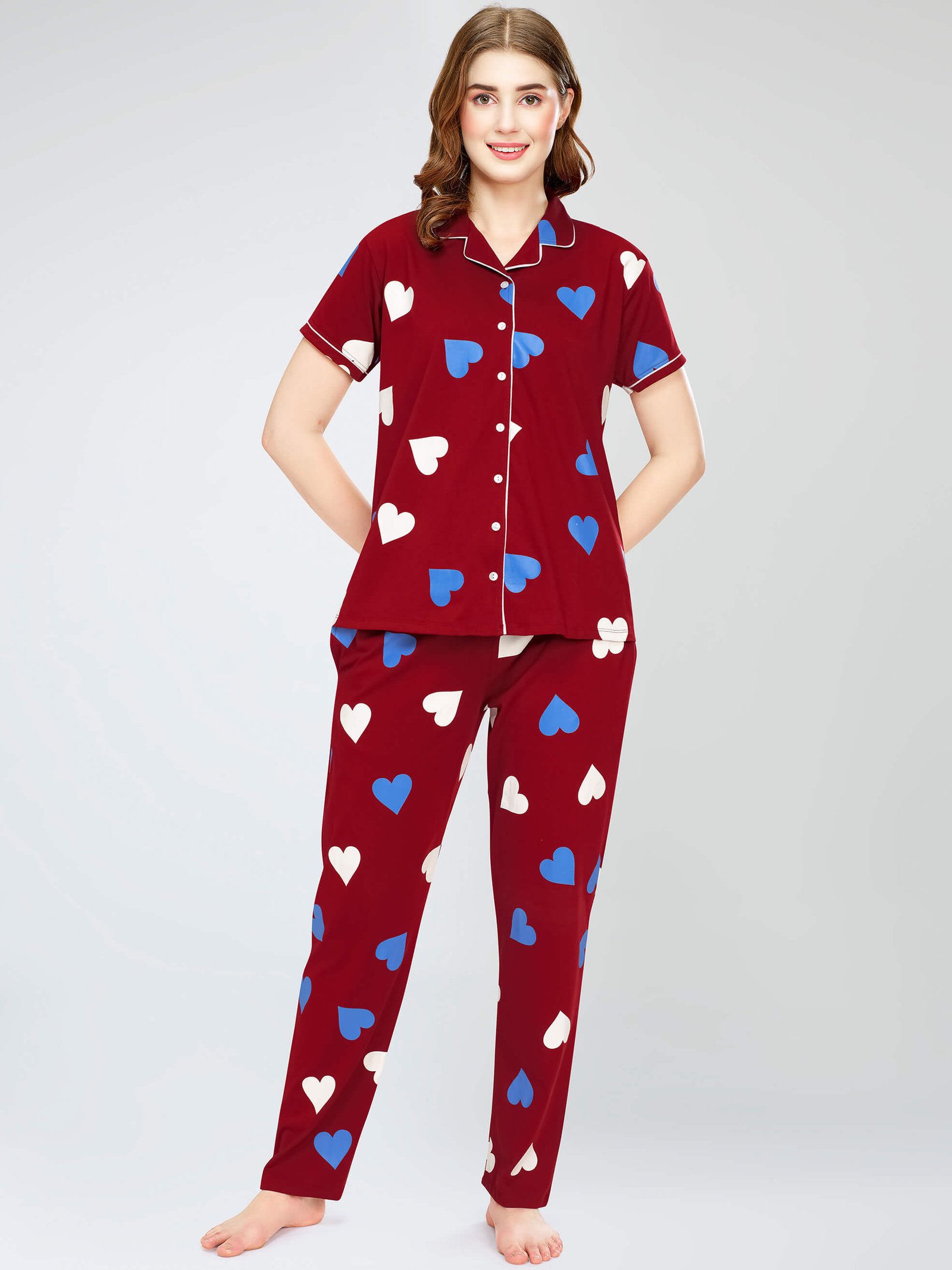 - Maroon Heart printed night suit consists of shirt and pyjamas