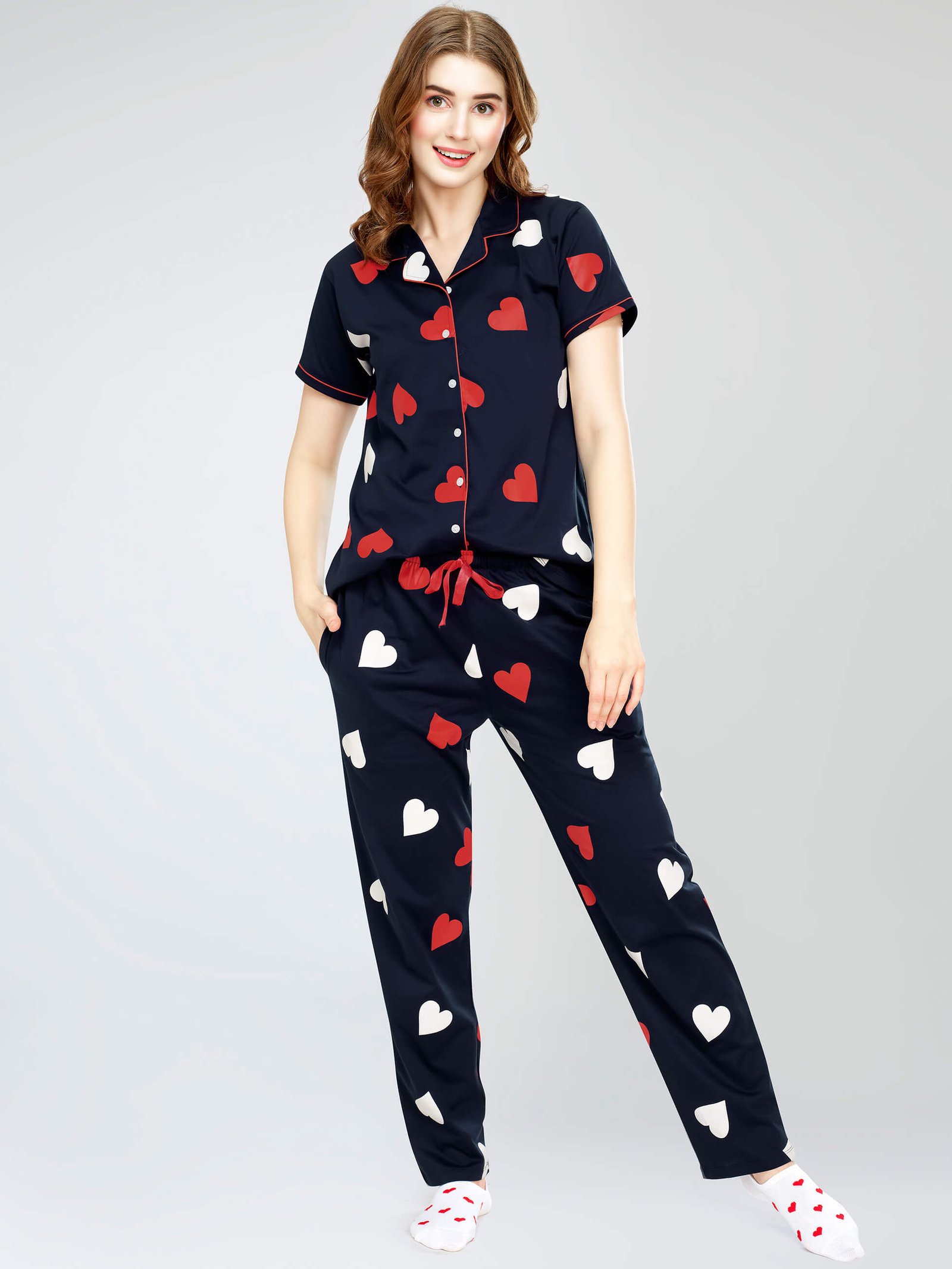 - Navy Blue Heart printed night suit consists of shirt and pyjamas