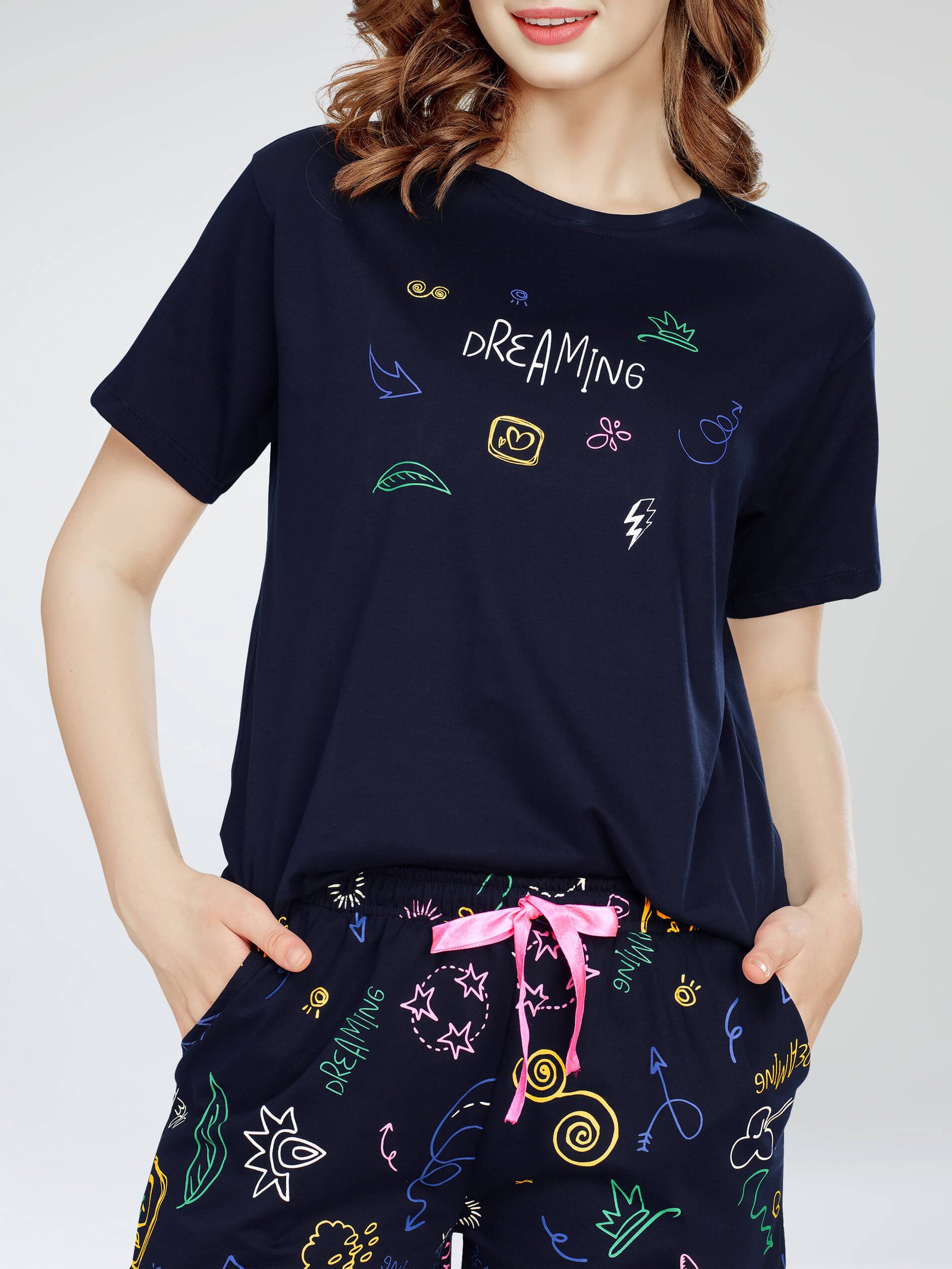 - Navy Blue printed night suit consists of crop top and shorts