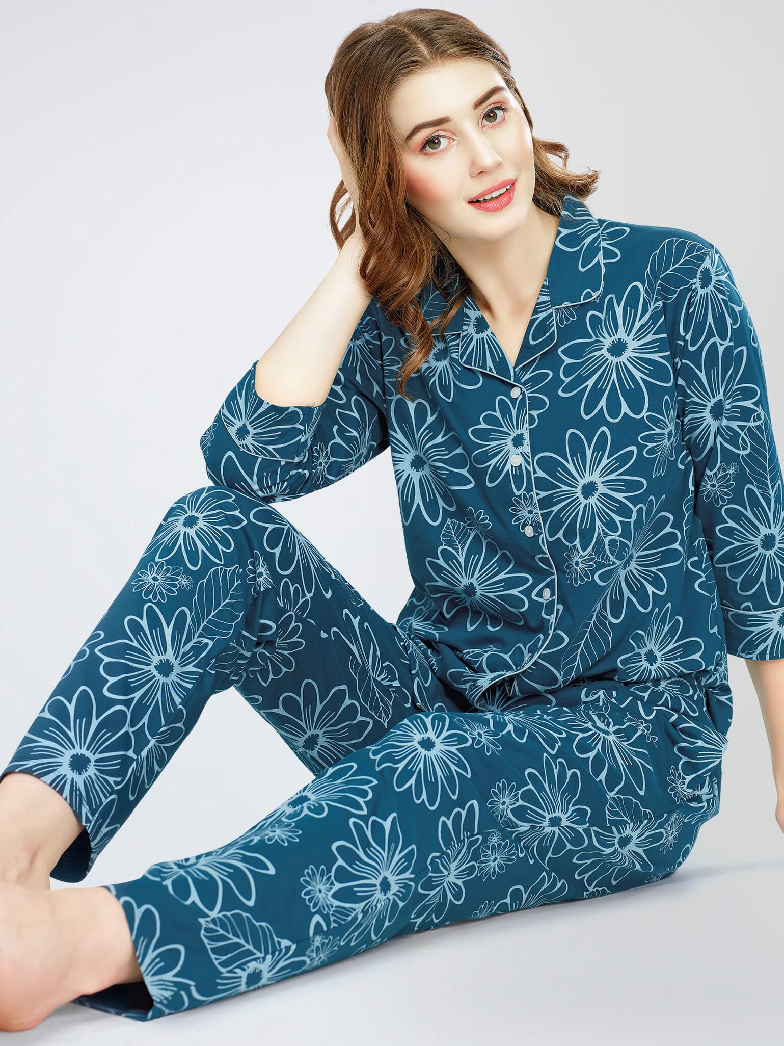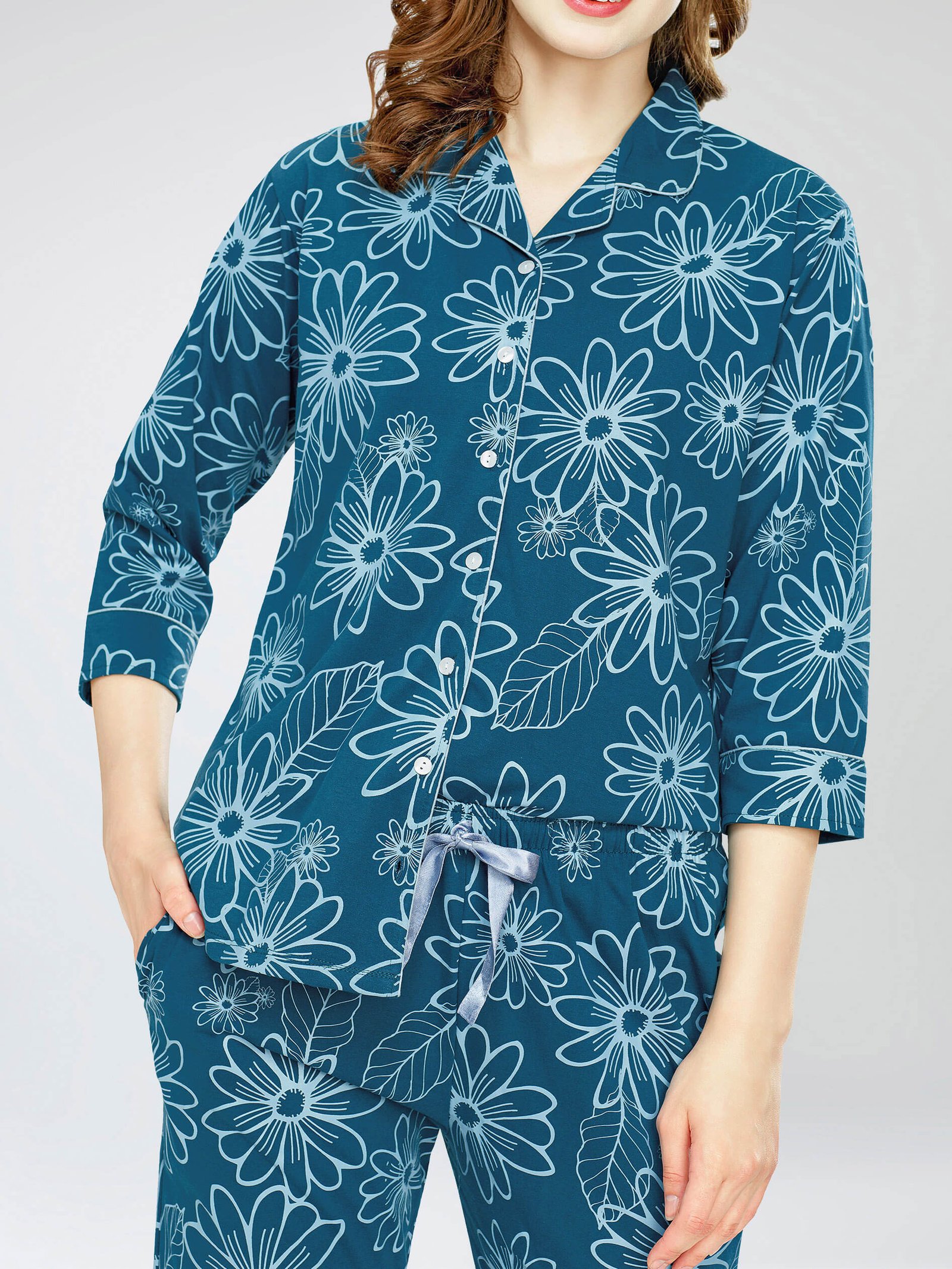 - Teal Blue Floral printed night suit consists of shirt and pyjamas