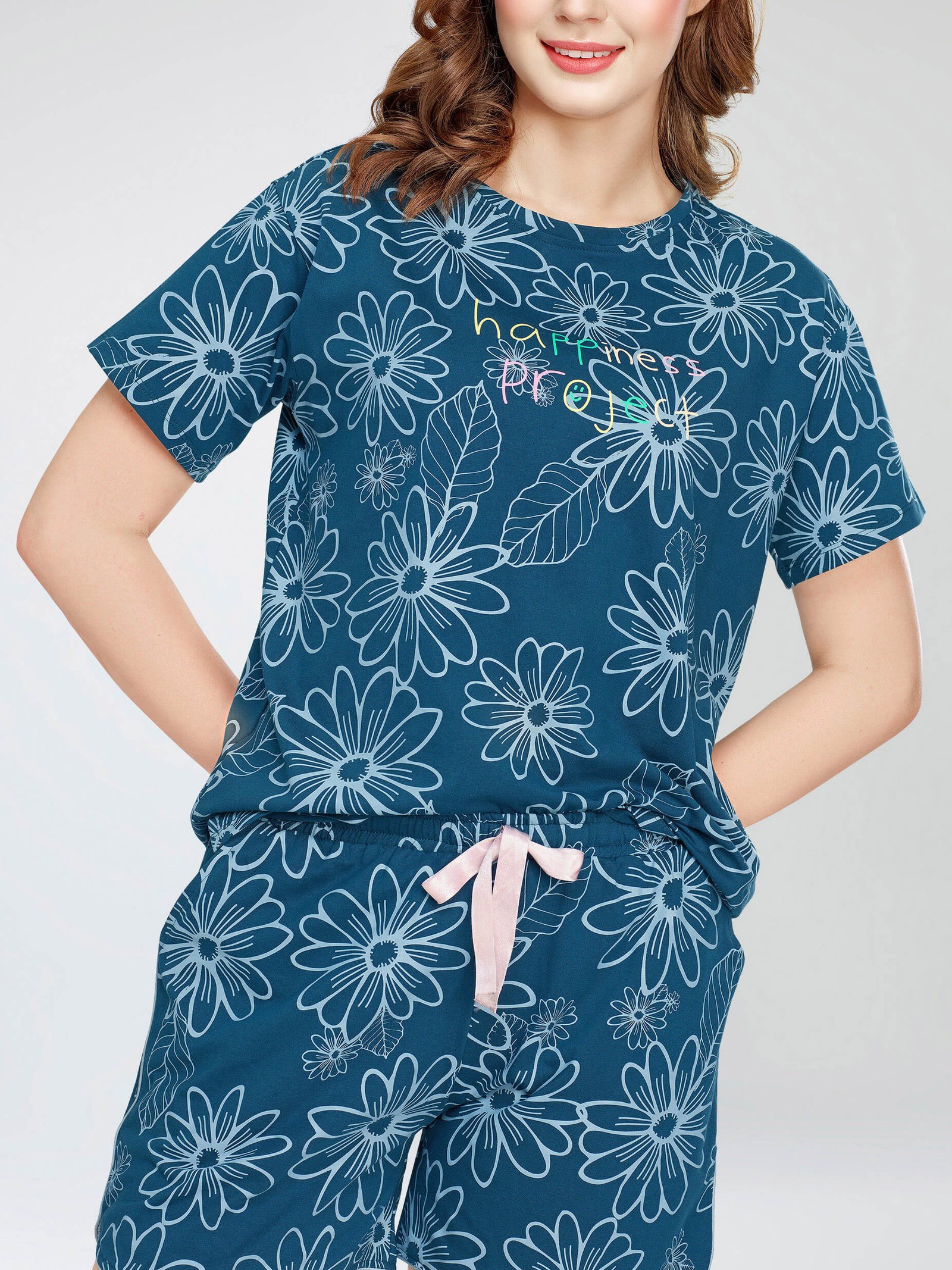 - Teal Blue Floral printed night suit consists of crop top and shorts