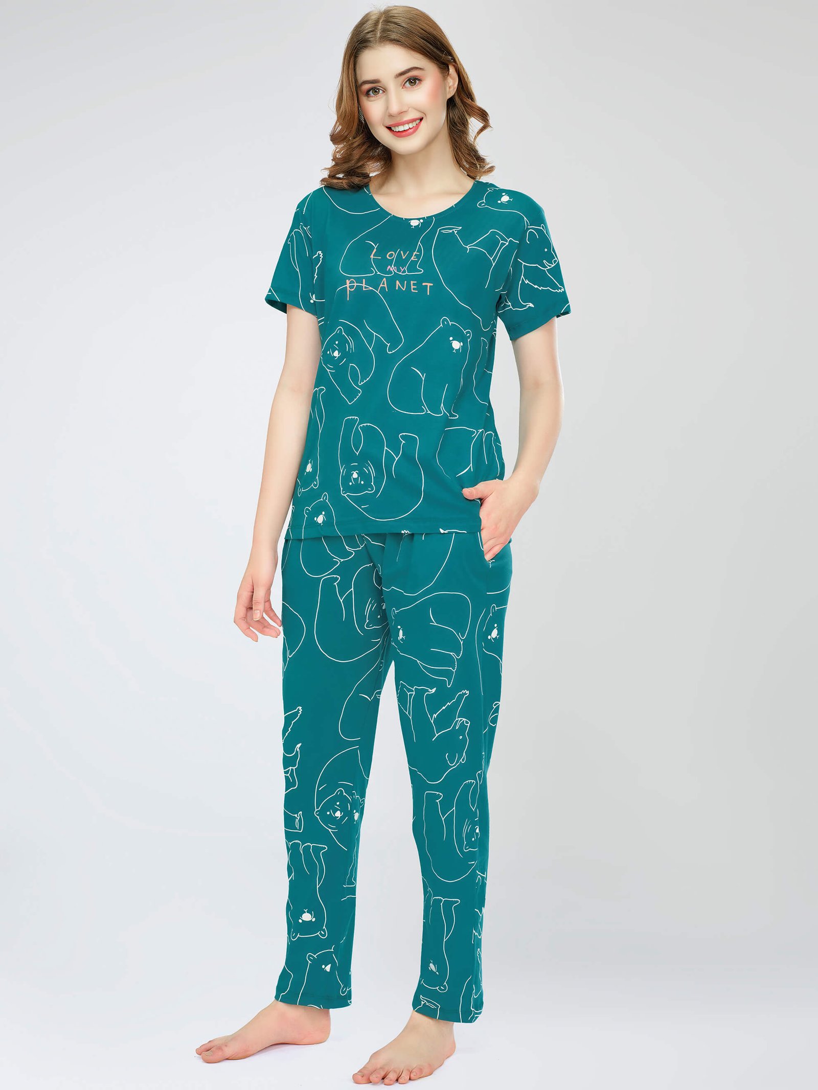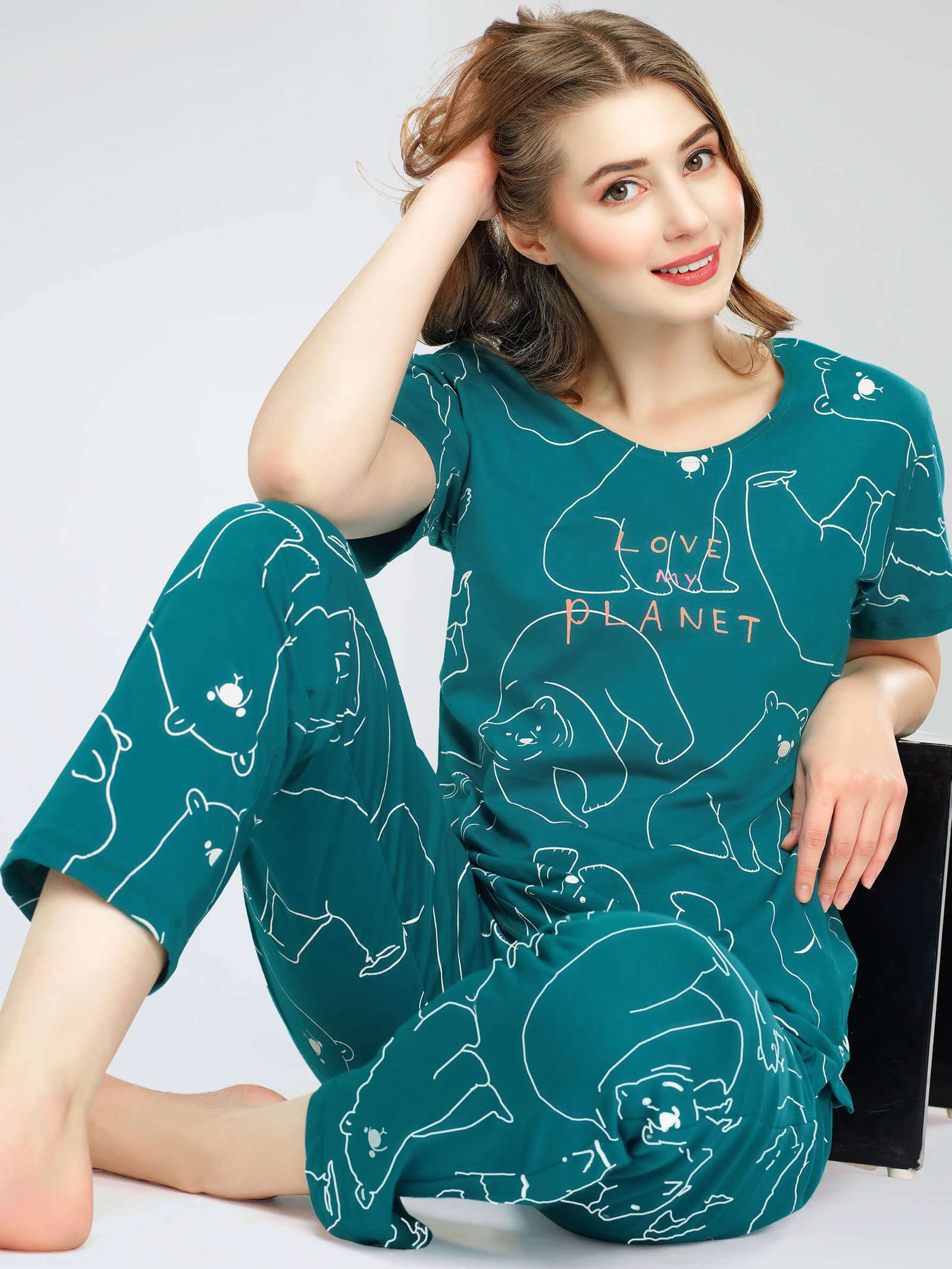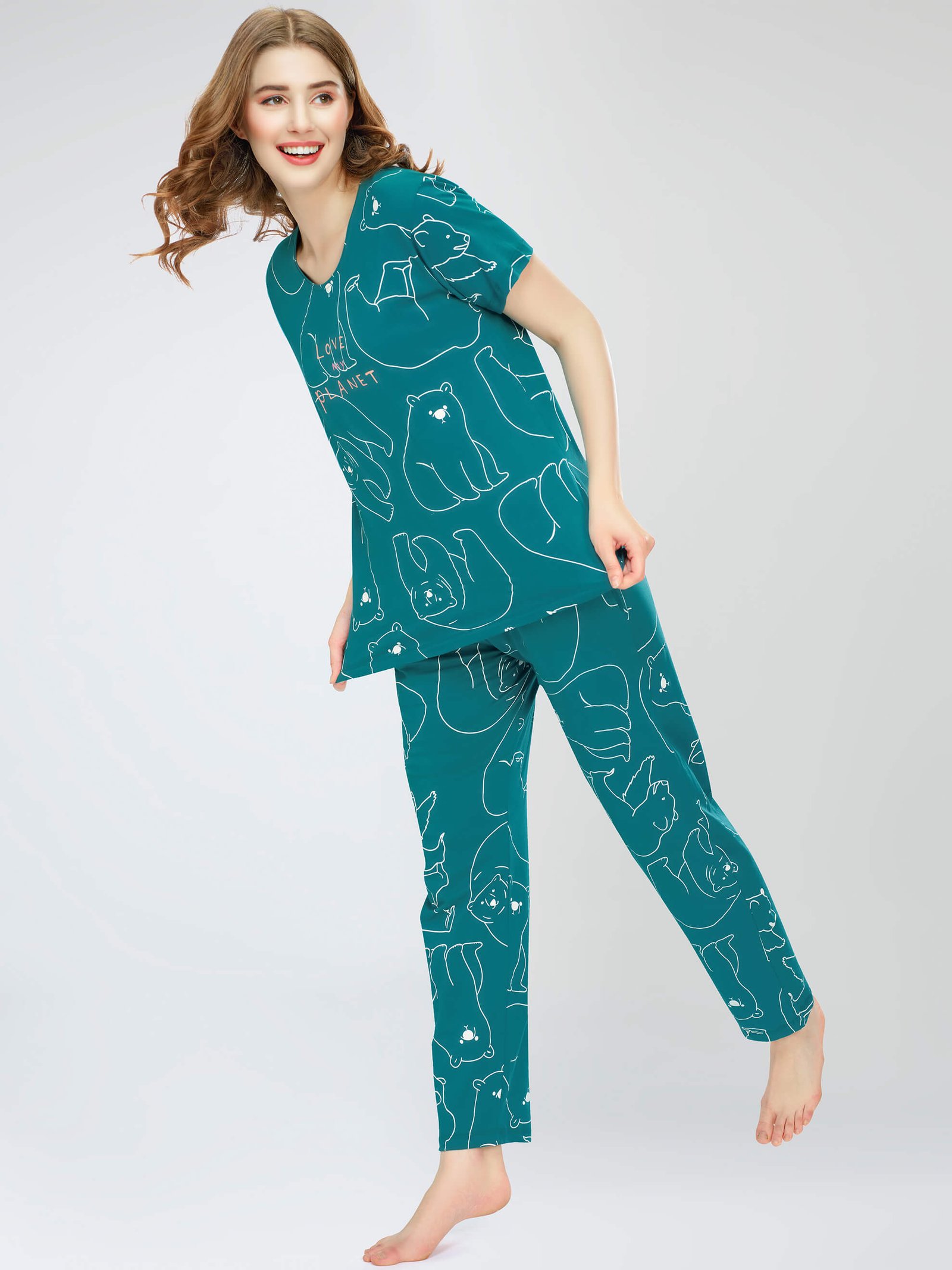 Women’s Teal Green Polar Bear Printed Cotton Night Dress of Top and Pajama set